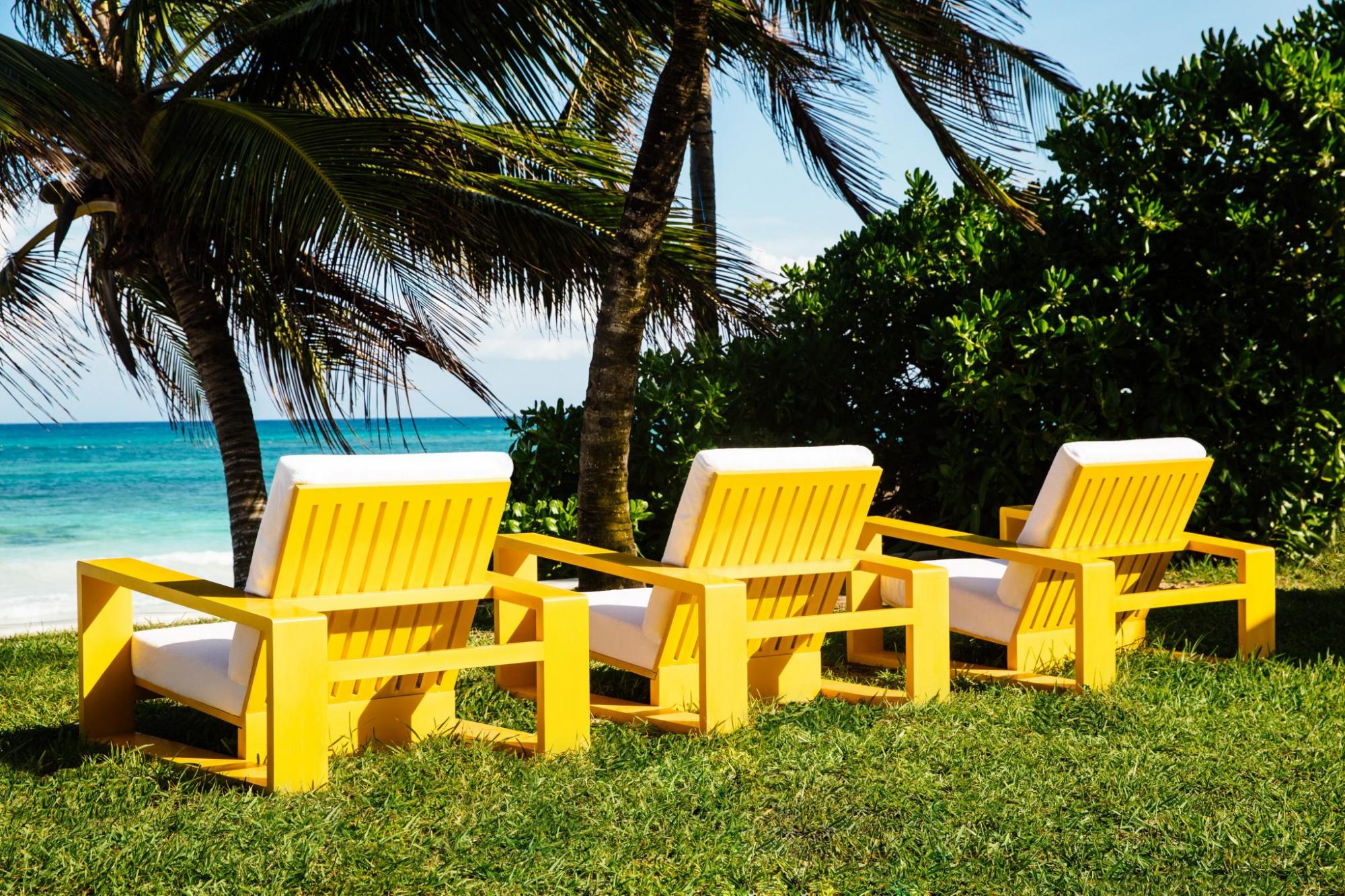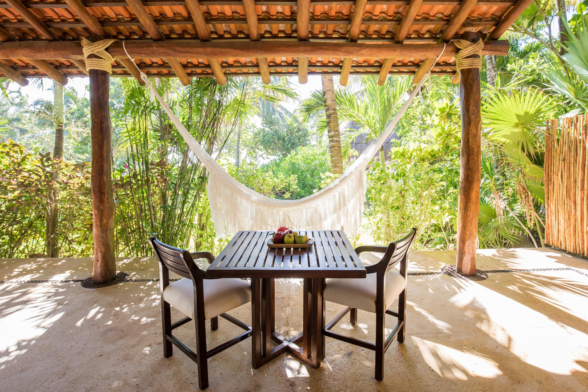 • At the east end of the gardens is Hotel Esencia’s new health club overlooking the estate’s cenote. Housed under traditional palapa roofs, the fitness room, juice bar and spa integrate hallmarks of modern wellbeing with ancient customs of cultivating beauty, balance, and peace.