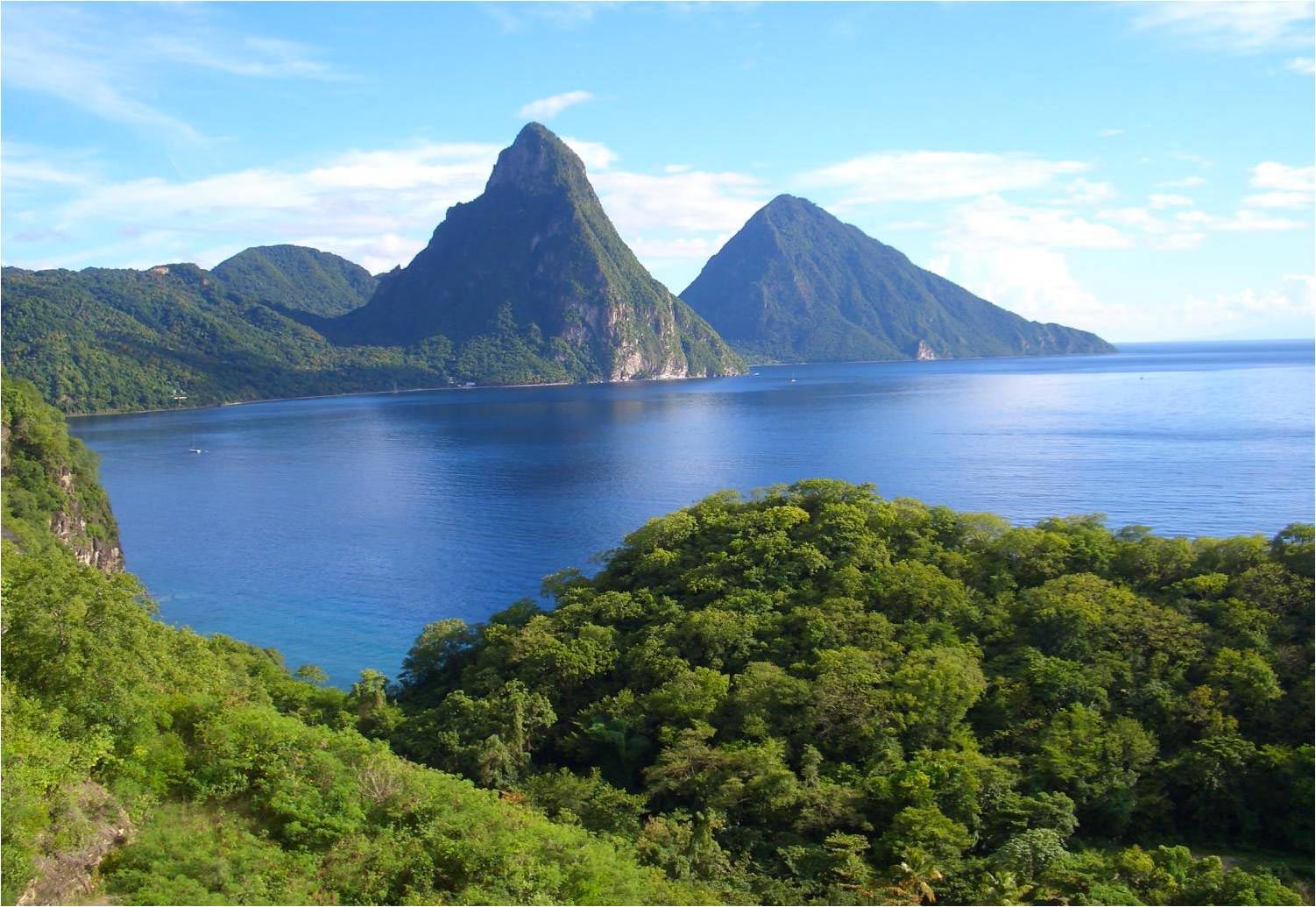 The volcanic island of St. Lucia is more mountainous than most Caribbean islands. The famous Pitons, form the island's best known landmark. Other attractions include a drive-in volcano, botanical gardens and rainforests. The beaches seem untouched. The island is green and lush. An island helicopter tour is greatly recommended.